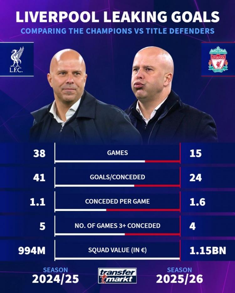 防守下滑!利物浦上赛季英超场均丢1.1球,本赛季场均丢1.6球